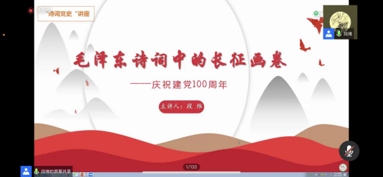 随后段维又旁征博引,诗词鉴赏穿插历史背景的讲述,生动的党史课带领大家“诗史合一”品味毛泽东诗词独特的艺术魅力,领悟诗词间磅礴大气的革命情怀,将毛泽东在翻越六盘山后所作的《清平乐·六盘山》中的“屈指行程二万”,与李白的《望庐山瀑布》中的三四句“飞流直下三千尺,疑是银河落九天”相对比,让大家深刻并形象的理解了长征的艰辛曲折,为了使观众更好的体会与理解诗词中藐视一切艰难困苦的意志,与毛泽东抒发出的无限豪情壮志,段维再次将李煜的《清平乐》“离恨恰如春草,更行更远还生”与毛泽东的《清平乐·六盘山》等诗句进行了解读。最后段维与大家一起解读了毛泽东具有总结性的《七律·长征》这首壮丽诗篇并分享了毛主席改诗的故事,诗词的灵动、史实的厚重和讲诉的真挚有机融为一体,使党史知识潜移默化、“声”入人心,会议至此圆满结束。