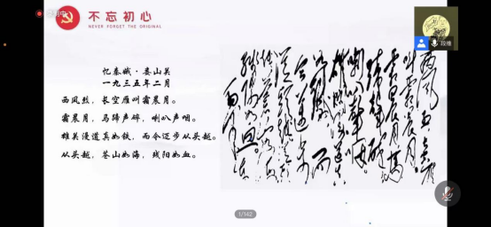 讲座中,段维首先对同学们介绍了长征故事,并结合长征故事将毛泽东对长征伟大意义的总结做了解读。随后段维带领同学们真正学习了几首毛泽东有关长征的诗词,带师生们一起感受了毛泽东作为伟大政治家、军事家、诗人,还有书法家的魅力!讲座围绕着《忆秦娥·娄山关》展开,“西风烈,长空雁叫霜晨月。霜晨月,马蹄声碎,喇叭声咽。雄关漫道真如铁,而今迈步从头越。从头越,苍山如海,残阳如血。”段维分别对《忆秦娥·娄山关》诗词意象、叠句手法和诗词背后的党史故事进行了深度赏析和融合讲解,从诗词的结构到情感、从精神到意境,详细生动的讲解了诗中展现的场景与风华,接着将《忆秦娥·娄山关》“西风残照,汉家陵阙”与李白的《忆秦娥》“苍山如海,残阳如血”相对比,结合两诗的意境与气势生动的讲解了娄山关大捷。精彩的诗词讲解、鲜为人知的党史故事、穿插着珍贵的历史影像,段维带领线上观众一起走进“娄山关”,讲述中国共产党的伟大转折、精彩历史。